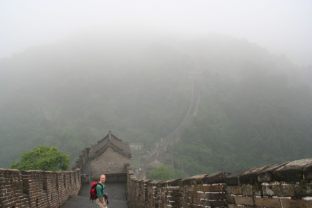 Toen we op een gegeven moment het idee begonnen te krijgen dat al die paleizen toch wel erg veel op elkaar leken, hebben we het verder voor gezien gehouden. We zijn toen teruggewandeld naar de metro en zijn richting hotel gegaan. Onderweg hebben we bij het toeristenbureau een taxi geregeld voor ons uitstapje naar de Grote Muur bij Mutianyu. Ook hebben we bij een supermarkt alvast een lunchpakket samengesteld. Daarna hebben we een uurtje in het hotel geluierd en ’s avonds hebben we in het restaurant van het hotel gegeten. De menukaart was wel in het Engels maar niemand sprak die taal. Toch is het ons gelukt een lekkere maaltijd samen te stellen. Maandag 10 juli 2006 Geheel tegen onze verwachting in stond onze chauffeur voor de Grote Muur vanmorgen om kwart voor zeven voor onze deur. Hij sprak geen Engels maar aan de fanatieke stuurbewegingen die hij maakte, dachten we te kunnen aflezen dat hij ons ergens heen wilde rijden. In ongeveer twee uur bracht hij ons naar een stuk Chinese Muur bij Mutianyu. Volgens ons was het niet de snelste route maar zo vermeed hij wel de tolweg. Toen we in Mutianyu aankwamen, was het daar nog erg rustig. Op de parkeerplaats stonden welgeteld 2 busjes en 8 auto’s. De verkopers waren hun winkels nog aan het openen dus werden we nauwelijks lastig gevallen met koude cola, water, T-shirts en ander prullaria. Ook bij het ticketbureau was niets te doen. Het was zelfs zo erg dat de meisjes bijna ruzie begonnen te maken over wie ons de kaartjes mocht verkopen. Voor de prijs maakte het helaas niets uit. Eenmaal in het bezit van een kaartje konden we op weg naar de kabelbaan. Deze bracht ons in enkele minuten zo’n 600 meter omhoog. Waar beneden het zicht al niet geweldig was, was het op de muur bijna niets. Nu stonden we dus op de Grote Muur maar konden we niet veel verder dan 60 meter van ons af kijken. Al die mooie vergezichten die je op plaatjes altijd ziet, gingen dus mooi aan onze neus voorbij. Desondanks was het toch een geweldige ervaring. Het stuk muur bij Mutianyu is over een lengte van ruim 2 kilometer helemaal gerestaureerd. Het is een van de minder toeristische stukken muur en dat was inderdaad te merken. We zijn bijna niemand tegen gekomen.