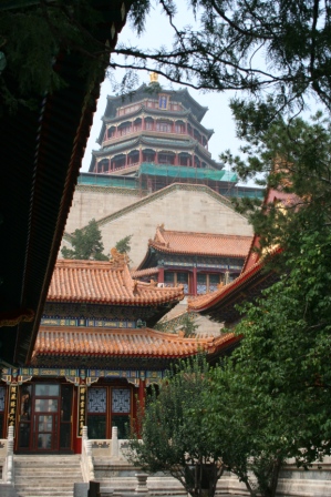 We hebben er ruim 2 ½ uur over gedaan om het stuk muur op en neer te wandelen. Het was geen eenvoudig wandelingetje. Door de vele steile stukken, de ongemakkelijk hoge en lage traptreden en de lastige combinatie van hoge temperatuur en hoge luchtvochtigheid was het behoorlijk afzien. De t/shirts waren halverwege al doorweekt van het zweten en de flesjes water gingen er in een rap tempo doorheen. Gelukkig hadden we voldoende drank bij ons. Zo konden we de drankverkopers die in iedere wachttoren zaten vrolijk lachend voorbij lopen. Nie Hao………! Bij de uitgang van het kabelbaanstation werden we via een smal paadje verder omlaag geleid. Aan beide zijden van het pad stonden verkopers met souvenirs. De dames met t/shirts gingen gewoon voor je staan zodat je wel moest stoppen (vonden / dachten ze…….. Niet dus!). Bij terugkomst op de parkeerplaats zat onze chauffeur rustig op ons te wachten. Op het moment dat we instapten, stopte het met zachtjes regenen en op de terugweg naar Beijing hebben we nog een paar flinke buien op ons dak gekregen. De rest van de middag hebben we een beetje voor pampus gelegen, de WK-finale gekeken (Forza Italia!!) en veel gedronken. Tegen de avond hebben we het gebied rond het hotel een beetje verkend. Het is een mix van traditionele hutongs en moderne hoogbouwwijken. Het restaurant dat we in de oude Dominicusgids vonden, bleek in een hutong te liggen die al vervangen is door een aantal grote hotels. Toch hebben we een leuk restaurantje gevonden waar we voor 84 ¥ weer lekker gegeten hebben. Onze tactiek bestaat eruit dat we steeds vier of vijf verschillende gerechten bestellen. De kans dat er dan een aantal bij zijn die goed smaken is dan erg groot. Zo ook deze keer. Enige minpunt was dat bij het kipgerecht de kip in stukken was gehakt voordat men de botten eruit had gehaald……… Dinsdag 11 juli 2006 Vandaag was het niet zo bewolkt als de voorgaande dagen. Je kon de zon goed voelen door de wolkenlaag heen en aan het eind van de dag waren we allebei dan ook flink verbrand. ’s Morgen hebben we eerst bij een supermarkt een ontbijt bij elkaar gescharreld en daarna hebben we de metro genomen naar Xizhimen. Daar hebben we een taxi genomen naar het zomerpaleis. De chauffeur sprak natuurlijk weer geen Engels maar door het aan te wijzen in de Lonely Planet begreep hij uiteindelijk toch waar we heen wilden. Het Zomerpaleis was het toevluchtsoord voor de keizer en zijn gevolg als het in de zomer te warm werd in de Verboden Stad. Het zomerpaleis is zowel in 1860 als 1902 door de Europeanen verwoest maar steeds weer opgebouwd. De laatste keer door regentes Cixi die het budget voor de modernisering van de Chinese vloot voor gebruikte. De enige boot die echter van het geld gebouwd werd, was de marmeren boot die in het Kunmingmeer ligt.