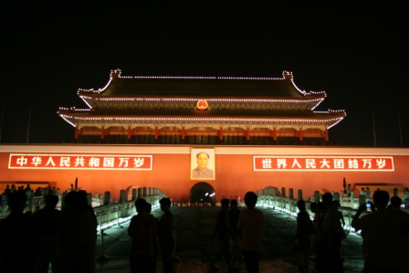 Na het eten zijn we terug gegaan naar het hotel. Daar hebben we ons even verfrist en daarna was het tijd voor ‘Beijing by night’. Petra wilde graag een avondmarkt bezoeken maar die viel behoorlijk tegen. Veel eettentjes en verder wat kraampjes met toeristenprullaria. Na een kort bezoekje aan het Tian’an Men-plein voor wat foto’s van ‘Mao by night’ zijn we weer terug gegaan naar het hotel. Daar werden rond half elf de treinkaartjes voor onze volgende etappe afgegeven dus dat is ook weer geregeld. Woensdag 12 juli 2006 Na de zoveelste nacht met onweer en stortregens moesten we voor twaalf uur uitchecken uit het hotel. Onze bagage konden we in bewaring geven zodat we daar niet de hele dag mee hoefden te sjouwen. Na in onze favoriete supermarkt weer een ontbijt bij elkaar te hebben gekocht, zijn we per metro naar de Lama-tampel vertrokken. Deze tempel is de belangrijkste Tibetaanse Boeddhistische tempel buiten Tibet. Voordat het een Lamatempel werd, was het de residentie van Yin Zhen die later bekend zou worden als keizer Yong Zheng. De tempel is recentelijk helemaal opgeknapt en het zag er prachtig uit. Het complex bestond uit vele gebouwen die allemaal mooi versierd waren en waar binnenin allemaal grote en kleine Boeddhabeelden stonden. Het topstuk van de tempel is een beeld van bijna 30 meter hoog. Het bijzonder is dat het beeld gemaakt is uit één stuk hout: een wereld record. Om dit te bevestigen hangt buiten de plaquette van het Guinnes Book of Records.