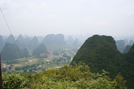 Op en neer naar Yangdi want verder mochten deze gammele bootjes blijkbaar niet varen. De rest van de rivier is het domein van de grote cruiseschepen die vanuit Guilin opereren. Een continue stroom van deze boten, volgeladen met Chinezen, voer in de richting van Yangshuo. Op het achterdek van de schepen waren koks druk bezig met koken en binnen zaten de Chinezen om 10 uur al uitgebreid te eten.Al die luxe hadden wij niet. We waren al blij dat we op een ieniemienie krukje konden zitten en dat het dak open kon. Zo was het ten minste wat koeler en konden we wat beeldmateriaal schieten. Het uitzicht op de pieken was weer adembenemend. Jammer was wel dat het flink heiig was.