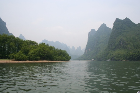 Eenmaal terug in Yangshuo werden de fietsen ingeleverd en werd de gids betaald. Ook hebben we haar gevraagd om voor de volgende dag voor ons een bootexcursie naar Xingping te organiseren. Woensdag 2 augustus 2006 Om negen uur stond er bij de receptie iemand klaar om ons naar de juiste bus op het busstation te begeleiden. Bij nader inzien was dit volledig overbodig want alles stond prima aangegeven. In Xingping was het wel handig dat we vooraf e.e.a. geregeld hadden. Bij het busstation werd de bus ‘bestormd’ door mensen met briefjes in de hand. Daaronder iemand met een papiertje met daarop de namen ‘Tim en Tetra’. Aangezien dit toch wel erg op onze namen leek, zijn we met de betreffende dame meegelopen. Ze bracht ons naar de haven waar we in een veerbootje werden geladen en naar de andere kant van de Li-rivier werden gebracht. Daar moesten we weer een stukje lopen en vervolgens werden we zo maar ergens langs de kant opgepikt door een bootje. Samen met een tiental Chinezen werden we vervolgens anderhalf uur lang over de rivier gevaren.