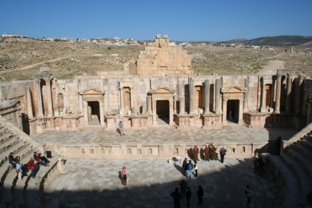 Na het ontbijt vertrokken we voor een bezoek aan de opgravingen in Jerash. Onder leiding van de nieuwe lokale gids, Nazir, mochten we hier een paar uurtjes rondkijken. Nazir wist het echter bij groep al vrij snel te verpesten. Hij begon al met ons op te jagen toen we nog maar nauwelijks uit de bus waren en daarna probeerde hij op redelijk autoritaire wijze ons te dwingen naar zijn verhaal te luisteren. Daar was niet iedereen van gediend….. Toen hij het vervolgens tot drie keer toe presteerde om zijn verhaal te onderbreken om zijn mobiele telefoon op te nemen, had hij het helemaal verpest. Tijdens zijn laatste telefoontje is iedereen gewoon weggelopen en zelf op pad gegaan. Desondanks was het wel bijzonder de moeite waard. Jerash is gesticht door de Grieken onder Alexander de Grote, uitgebreid door de Nabateërs als bescherming van hun handelsroutes, verder uitgebouwd door de Romeinen en uiteindelijk nog verder verrijkt met kerken door de Byzantijnen. In 747 na Christus verwoestte een aardbeving de stad en vertrokken de inwoners. Daarna werd er zo’n 1000 jaar niets meer van vernomen. Tegenwoordig zijn er nog twee amfitheaters te bewonderen, is er nog een hippodroom en zijn er nog vele restanten van pilaren, tetrapylonen, tempels etc. te bewonderen.