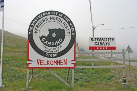 Omdat we het wel een beetje gezien hadden, zijn we terug gereden nar Skarsvåg en hebben daar een camping opgezocht. Deze meest noordelijke camping ter wereld lag best mooi aan een meertje maar het was er niet erg aangenaam. Het was mistig en winderig dus was er niet veel te genieten. Na het opzetten van de tent hebben we nog een wandelingetje gemaakt naar Kirkeporten. In dit meest noordelijke vissersdorpje van de wereld hadden we het echter snel gezien. Tegen de avond begon de temperatuur langzaam te zakken. Na het eten was het nog zo'n negen graden. In de hoop nog een sprankje middernachtszon mee te te krijgen, zijn we toen nog maar eens terug gereden naar de Noordkaap. Helaas was hier de mist nog steeds ondoordringbaar. Het was er wel aanzienlijk drukker dan toen we er 's middags waren. Er stonden wel vijftien touringcars met Duitse, Nederlandse, Spaanse, Franse en Finse pensionado's. Ondanks deze drukte hebben we toch nog onze kaarten op de post kunnen doen en hebben we de film in de supervideograaf bekeken. Deze panoramafilm op 125° grootbeeldscherm was er mooi. De beelden vanuit vogelperspectief waren zo levensecht dat Petra er reisziek van werd. Toen we weer wat waren opgewarmd, zijn we terug gegaan naar de camping waar we meteen de slaapzak ingedoken zijn.