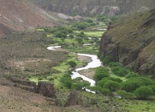 Eenmaal bij de laatste schilderingen gekomen, werden de Amerikanen door hun gids opgehaald om dezelfde weg terug te wandelen. Wij leverden onze helmen in en gingen met onze gids onder de railing door. Daar volgden we een smal paadje omlaag naar de Rio Pinturas. We gingen zo nog verder de canyon in en dat was wel erg mooi.