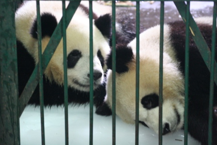 Vrijdag 21 juli 2006 Vandaag vroeg op pad om panda’s te kijken in het Pandafokcentrum. Aangezien de dieren rond half tien gevoerd worden en ze daarna alleen maar liggen en slapen, moesten we er dus op tijd bij zijn. Per taxi werden we netje voor de deur afgezet en na een kaartje gekocht te hebben, zijn we snel richting pandaverblijven gesneld. Al snel kwamen we er achter dat we buiten geen reuzenpanda’s zouden vinden. De dieren schijnen niet zo goed tegen de warmte te kunnen en dus werden ze binnen gehouden. Daar was airconditioning en er lagen grote blokken ijs waar de dieren op konden liggen. We konden ze dus wel bekijken maar alleen vanachter de tralies. Jammer maar het waren toch leuke dieren om te zien.