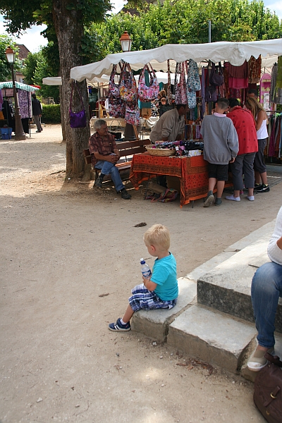 Rond half twaalf zijn we naar Sarlat gereden. Op woensdag en zaterdag is er markt in het stadje en daar schijnt nogal wat volk op af te komen. We hadden zaterdag wel al wat kraampjes zien staan maar we hadden ons er eigen lijk niet veel van voorgesteld. Het vinden van een parkeerplaats bleek een behoorlijke opgave. Uiteindelijk hebben we aan de andere kant van de stad in een woonwijk een parkeerplaats gevonden. Van daar uit was het nog wel een flink stukje lopen naar de markt maar zo krijgen we toch ook nog wat beweging. De markt was veel groter dan we verwacht hadden. In verschillende straten en op enkele pleintjes stonden allemaal kraampjes met levensmiddelen. Zoals verwacht was het er heel druk dus kostte het wat moeite om het lieve kleine blonde jongetje bij ons te houden. Toen hij verplicht aan de hand moest, was hij dan ook niet meer zo lief.