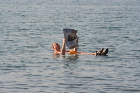 Nadat iedereen terug was in de bus, vertrokken we richting Dode zee. Daar hebben we ons eerst in het Mövenpickhotel volgegeten aan het buffet. Aangezien er ’s avonds geen tijd was om te eten, omdat we naar het vliegveld moesten, was dit ons diner. Na het eten mochten we dan eindelijk naar het water. Het was een bijzondere ervaring. In eerste instantie doe je nog moeite om te drijven maar al snel blijkt dit volledig overbodig. Zonder moeite blijf je op je rug in het water liggen. Het kost zelfs moeite om weer rechtop te komen. Ook het op de buik zwemmen lukt niet echt. Door het hoge zoutgehalte van het water is de opwaartse druk zo groot dat het grootste deel van je benen bovenwater is! Als je vervolgens uit het water komt en jezelf gewoon laat opdrogen dan blijven er overal vlokken zout op het lichaam achter. Het is net of je over je hele lichaam roos hebt.